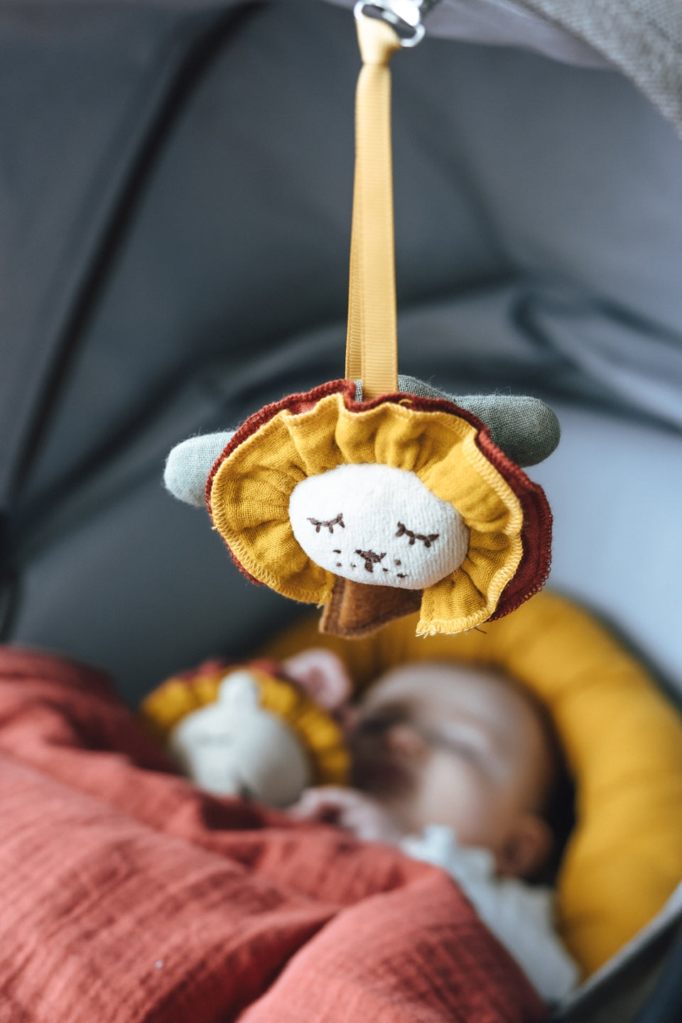 Zwei niedliche Mini-Figuren, bestehend aus Löwe und Wüstenbaum, baumeln am Clip. Sie rasseln und knistern.