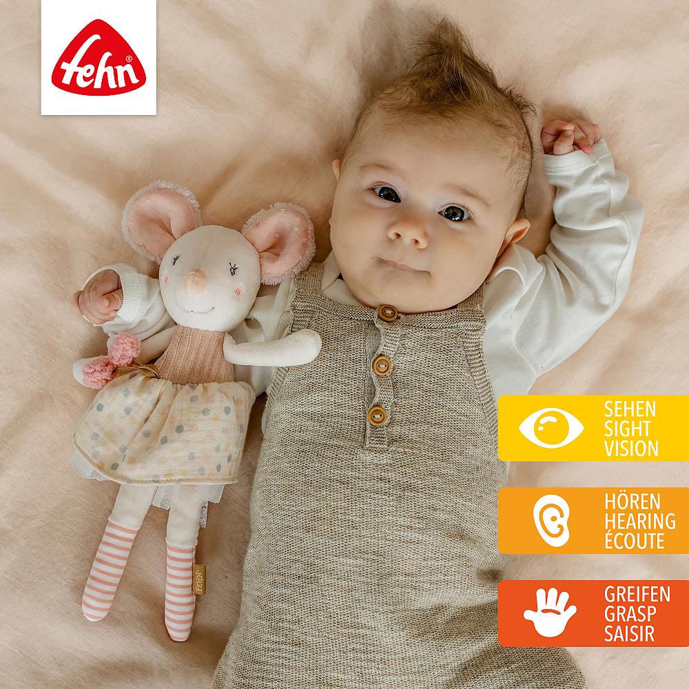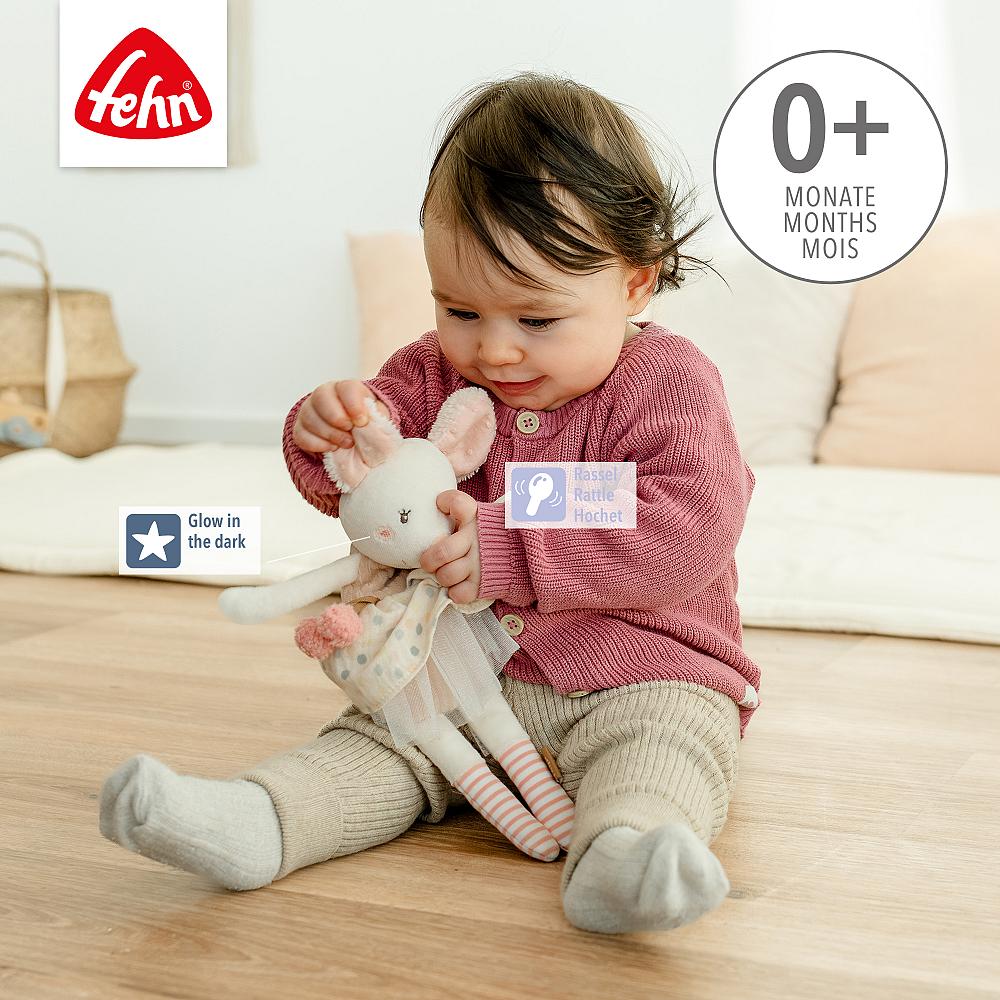 Die „Glow-in-the-dark“ Bestickung leuchtet im Dunkeln und so ist sie nachts eine tolle Beschützerin und Schlafbegleiterin. Sie lässt sich wunderbar knautschen und die Granulat-Füllung animiert zum Fühlen und Greifen. Die niedliche Maus ist die perfekte erste Freundin für Babys von Geburt an und eine tolle Begleiterin für zuhause & unterwegs!