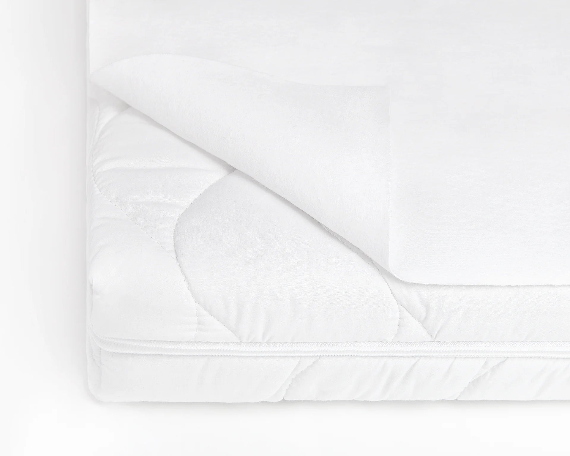 Die atmungsaktive, wasserdichte Betteinlage schützt die Matratze zuverlässig vor Nässe mittels einer Feuchtigkeitsbarriere aus eingearbeiteter PU-Folie.
