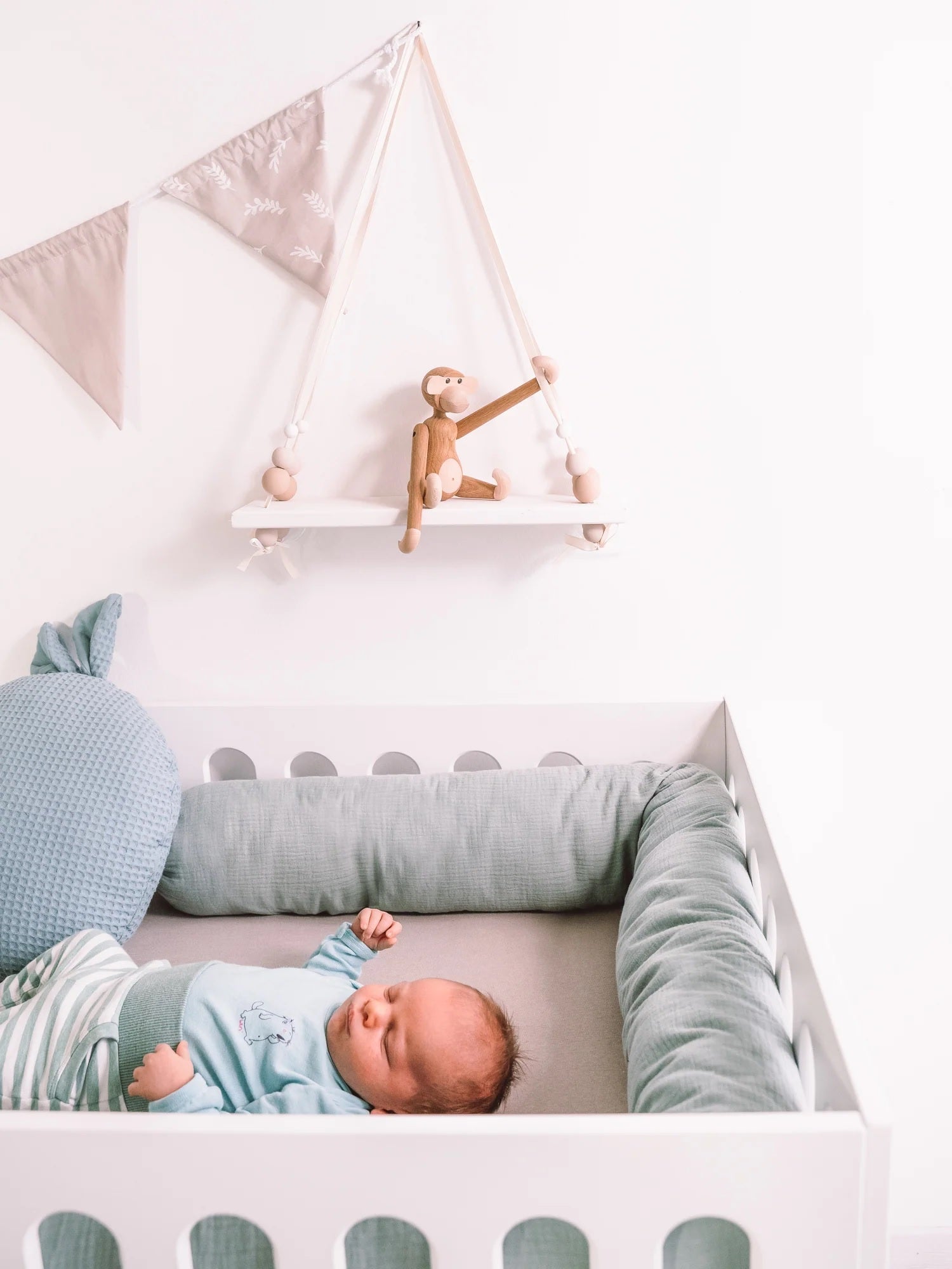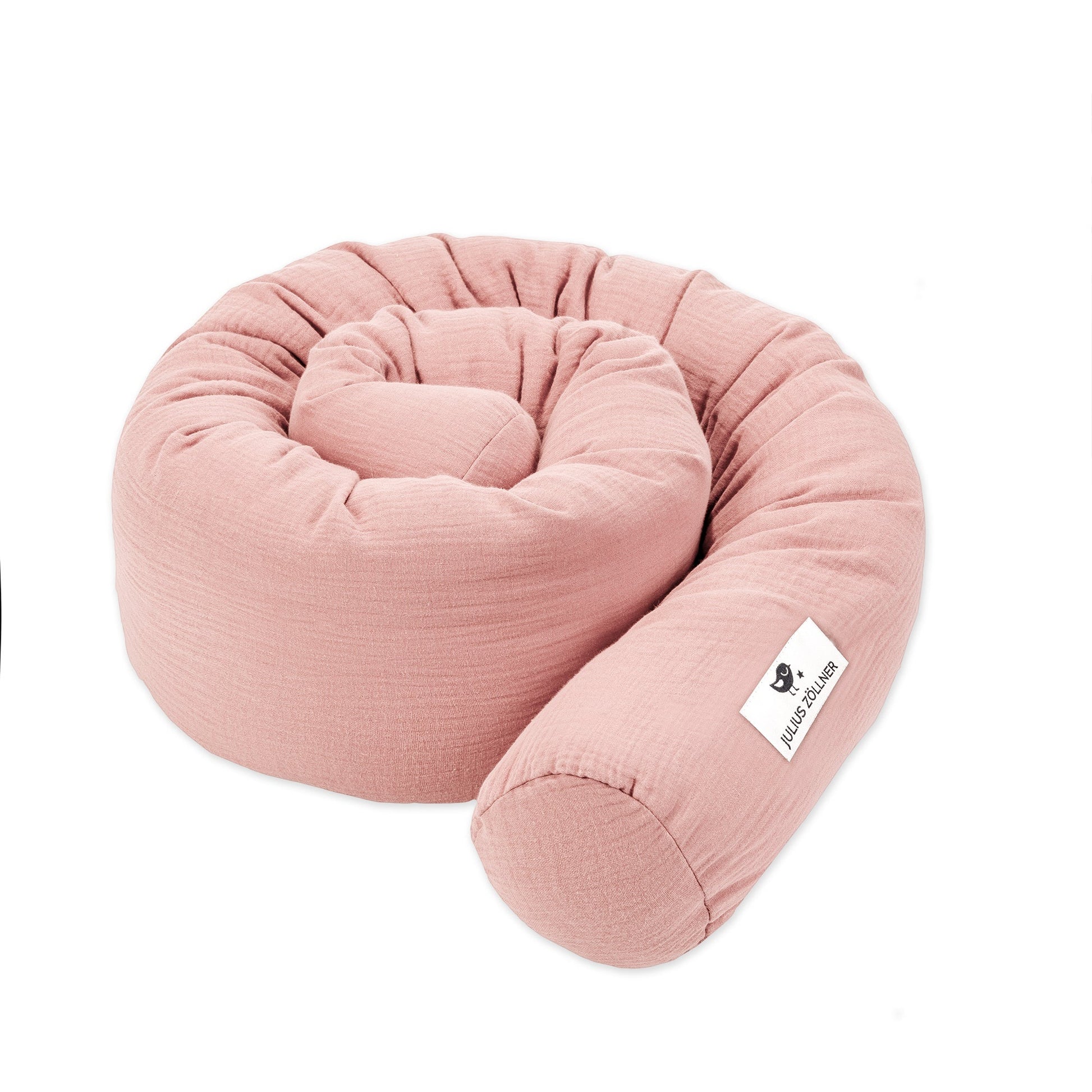 Die Bettschlange (Bettrolle) von Julius Zöllner ist 180cm lang und hat einen Durchmesser von 14cm. Sie schützt das Babyköpfchen vor den harten Stäben am Kinderbett und vor Zugluft. Sie ist zudem ein schönes Accessoire zum Spielen und Kuscheln.
