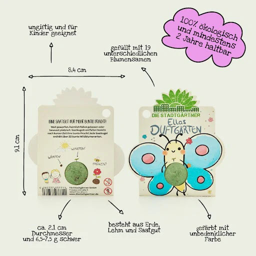 100 % natürlich: Die Blumenmurmel ist mit natürlichen Farben gefärbt und somit vollkommen ungefährlich für Kinder. Beim Saatgut handelt es sich um ungiftige Wildblumen.