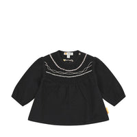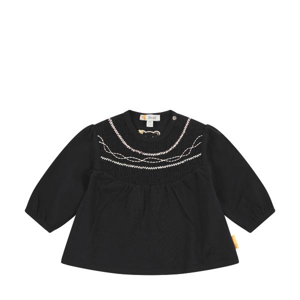 Diese Bluse aus Baumwolljersey überzeugt bereits auf den ersten Blick. Unsere Langarm-Bluse im A-Schnitt mit gesmokter Vorderansicht, besonderer Stickerei und süßen Rüschendetails zieht alle Blicke auf sich. Die Ärmel sind mit einem elastischen Abschluss versehen und die Schultern mit Druckknöpfen ausgestattet, um das Anziehen zu erleichtern.