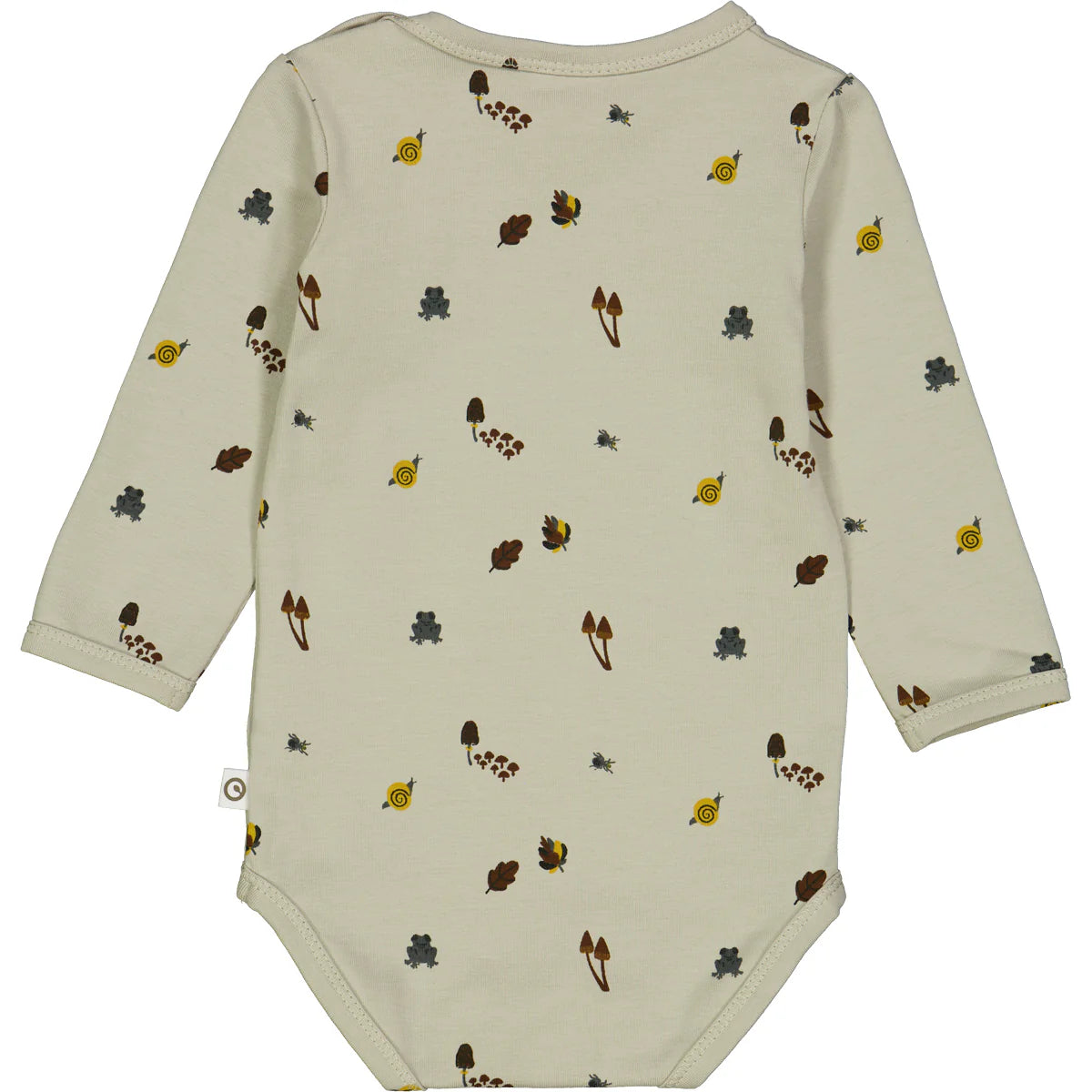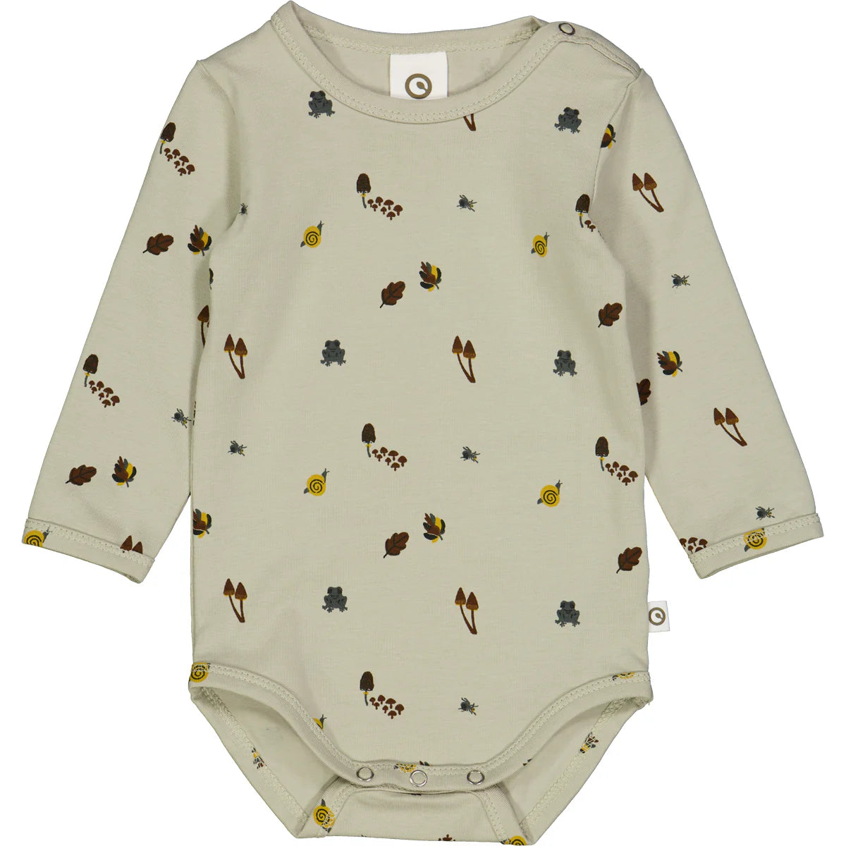 Entdecke den niedlichen Langarmbody mit entzückenden Waldmotiven auf einem zart oliven Hintergrund – perfekt für kleine Abenteurer! Der Langarmbody verfügt über süße Prints von bunten Pilzen, Blättern, Fröschen und Schnecken, die deinem kleinen Liebling einen charmanten und verspielten Look verleihen. Mit Druckknöpfen im Schritt und einem Druckknopf an der Schulter lässt sich der Body mühelos öffnen und schließen, sodass das An- und Ausziehen ein Kinderspiel wird.