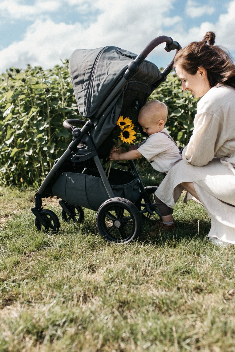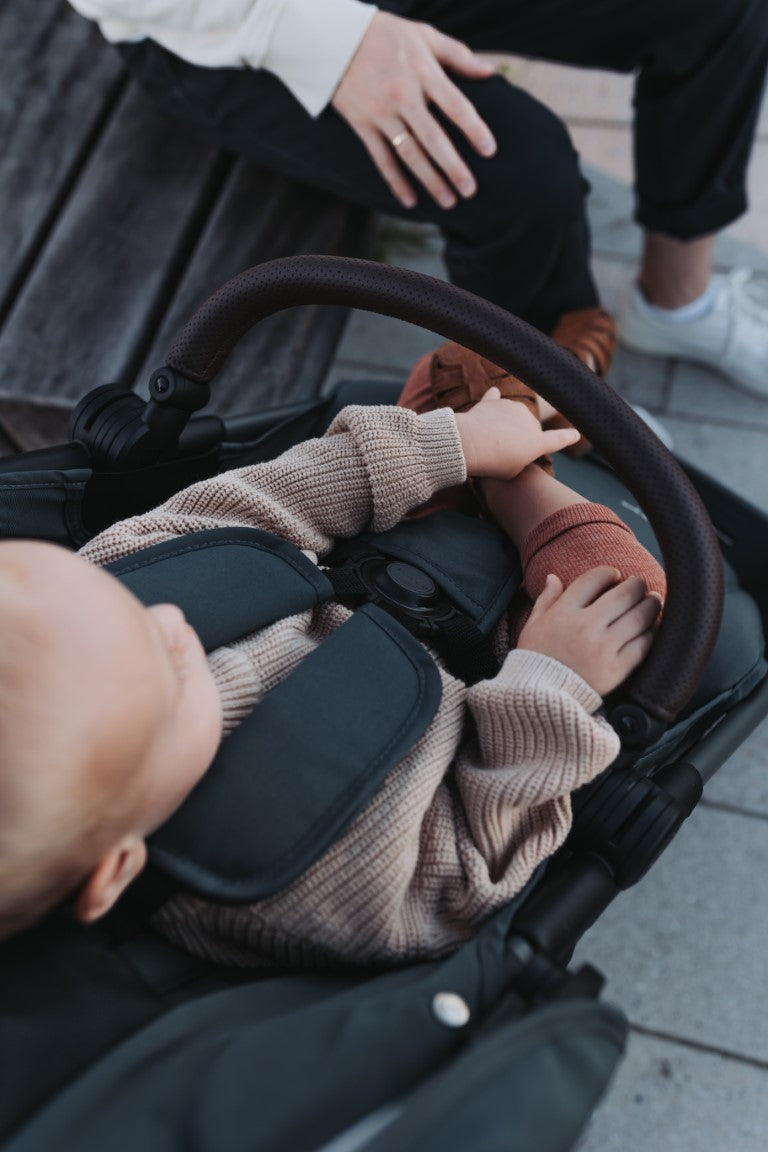 Die hochwertigen Textilien sind langlebig, strapazierfähig und einfach zu reinigen. Der Schiebegriff und der Sicherheitsbügel sind aus hochwertigen, veganem Leder.