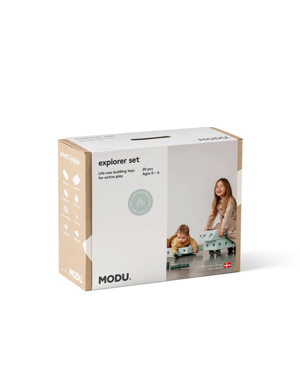 MODU ist ein kreatives, modulares Spielsystem, das Kinder in ihrer motorischen Entwicklung unterstützt. Das Explorer Set ist das Mittlere von 3 Sets und enthält verschiedene weiche, aber stabile Bauteile, die sich zu unterschiedlichen Bewegungs- und Balancespielzeugen zusammensetzen lassen. 🛻❤️😊