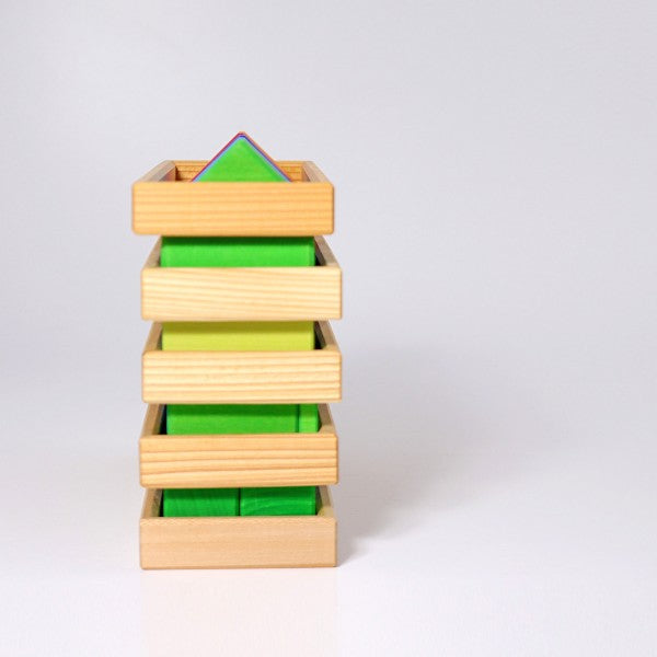 5 stapelbare Holzrahmen mit insgesammt 70 Bauklötzen in unterschiedlichen Formen: Dreiecke, Kuben und Quader, Zylinder und Plättchen. Holz: Lindenholz farblich lasiert, Rahmen geölt.