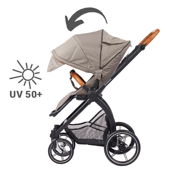 Die Sonne steht tief oder Du möchtest mehr als nur den Kopf schützen? Dank des verlängerbaren Verdecks und eines herausklappbaren Sonnenschilds hast