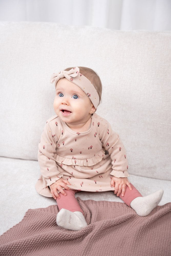 Einfach zauberhaft! Dieses schöne, etwas wärmere Kleidchen ist perfekt für die erste Feier. Es ist mit Bio-Baumwolle gefertigt und durch den Elastananteil sehr bequem. Druckknöpfe an der Schulter erleichtern das An- und Ausziehen.