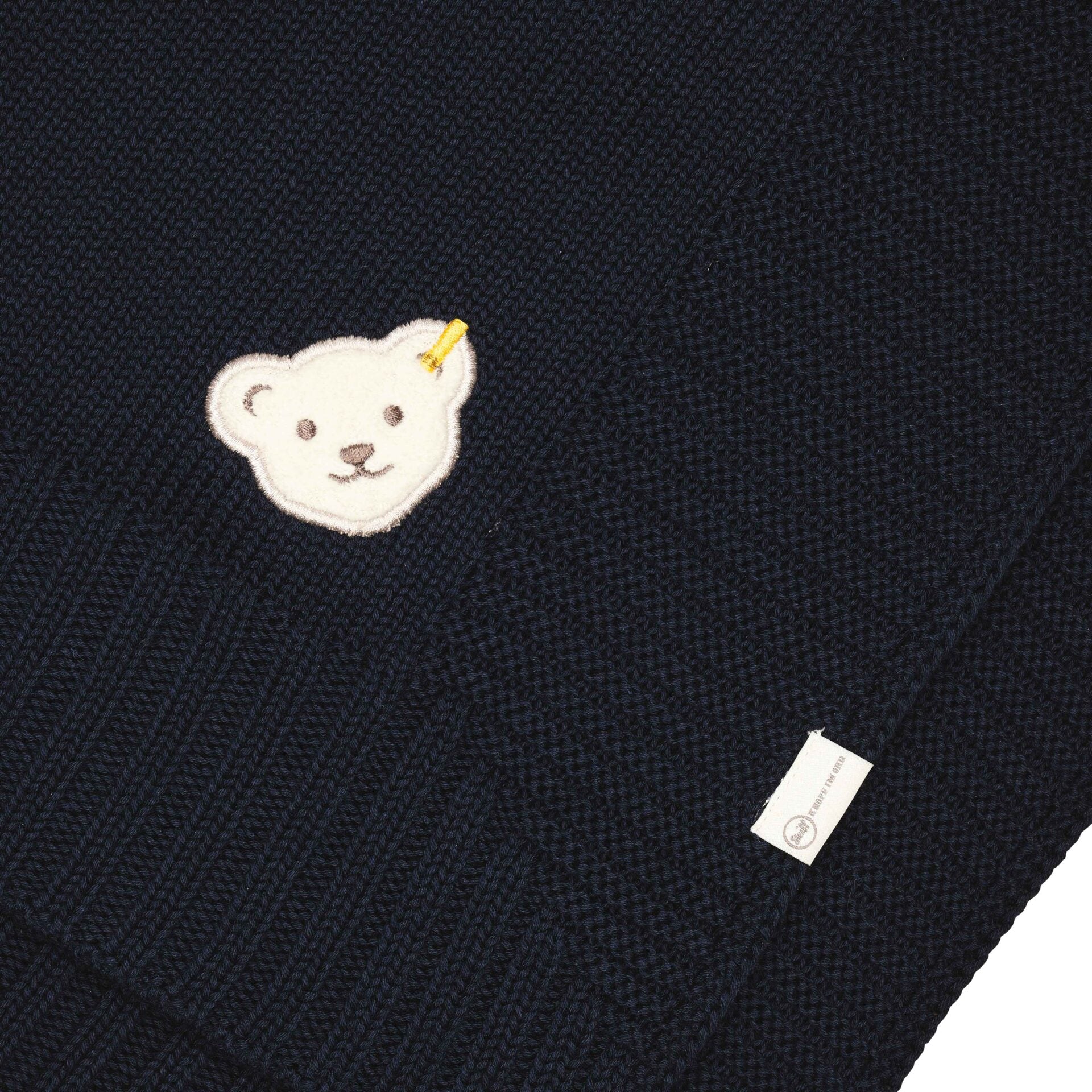 Flauschig weich bietet die Decke aus pflegeleichtem Baumwollstrick viele Einsatzmöglichkeiten. Ob als Wärmespender oder Dekoration, edles Navyblau, klassischer Strick und ein feingerippter Rand schmücken jeden Raum. Neben einem großen Steiff Teddybär auf der Deckenmitte begrüßt ein flauschiges Steiff Teddybärmotiv am Deckenrand jeden mit einem Lächeln. Die Strickdecke ist stabil, flexibel wie auch unkompliziert verstaubar, somit jederzeit bereit für eine Extrarunde Kuscheln. Das Baumwollsäckchen, in dem die Decke verpackt ist, kann nachhaltig weiterverwendet werden.