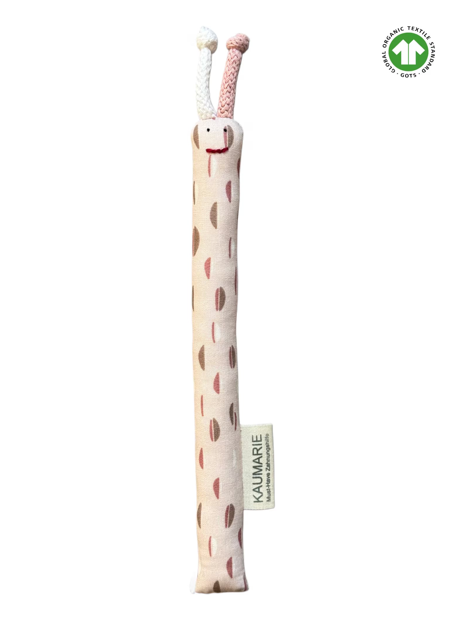 Die KAUMARIE hilft effektiv beim Zahnen, da durch das Kauen auf der Stoffstange ein wohltuender Gegendruck erzeugt wird, der Schmerz im Zahnfleisch lindert. Darüber hinaus eignet sich die KAUMARIE wunderbar als erstes Spielzeug zum Greifen lernen & üben der Hand-Mund-Koordination.