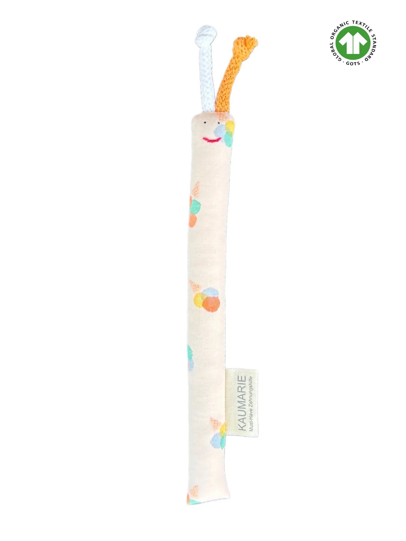 Die KAUMARIE hilft effektiv beim Zahnen, da durch das Kauen auf der Stoffstange ein wohltuender Gegendruck erzeugt wird, der Schmerz im Zahnfleisch lindert. Darüber hinaus eignet sich die KAUMARIE wunderbar als erstes Spielzeug zum Greifen lernen & üben der Hand-Mund-Koordination.