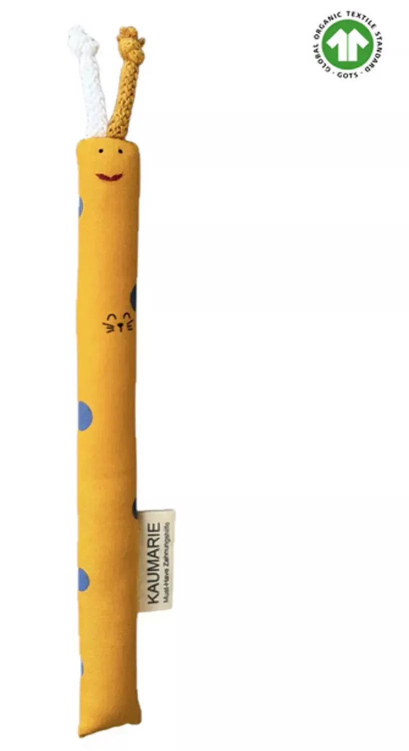 Die KAUMARIE hilft effektiv beim Zahnen, da durch das Kauen auf der Stoffstange ein wohltuender Gegendruck erzeugt wird, der Schmerz im Zahnfleisch lindert. Darüber hinaus eignet sich die KAUMARIE wunderbar als erstes Spielzeug zum Greifen lernen & üben der Hand-Mund-Koordination.