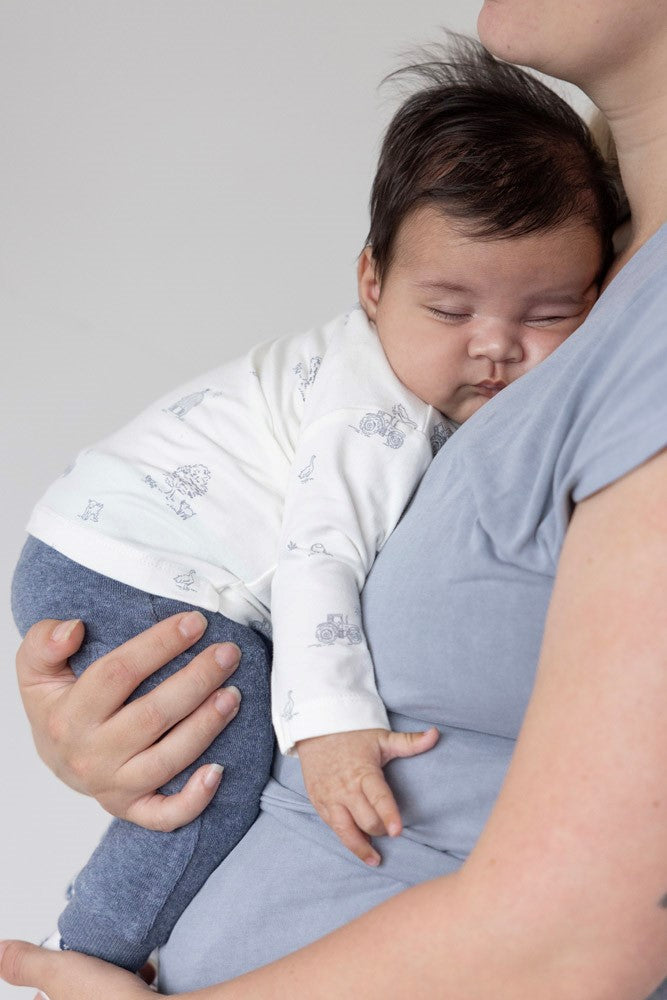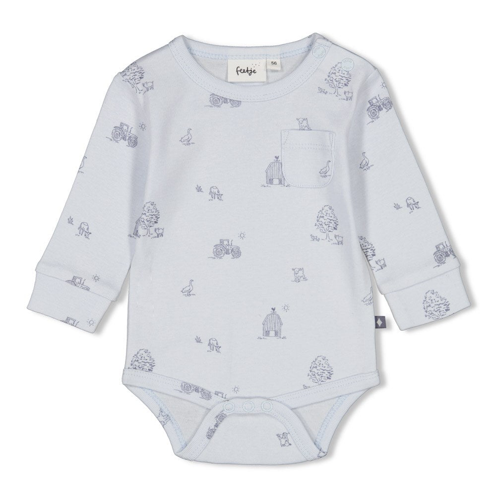 Diesen Body wirst du lieben! Einfach wunderschöne, weiche Superqualität aus feiner Bio-Baumwolle mit süßen Bauernhofmotiven. Fühlt sich sehr gut auf der Haut an und hat eine bequeme Passform. Druckknöpfe an der Schulter erleichtern das An- und Ausziehen. Ein echtes Lieblingsstück!