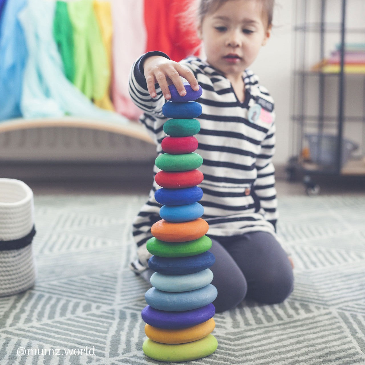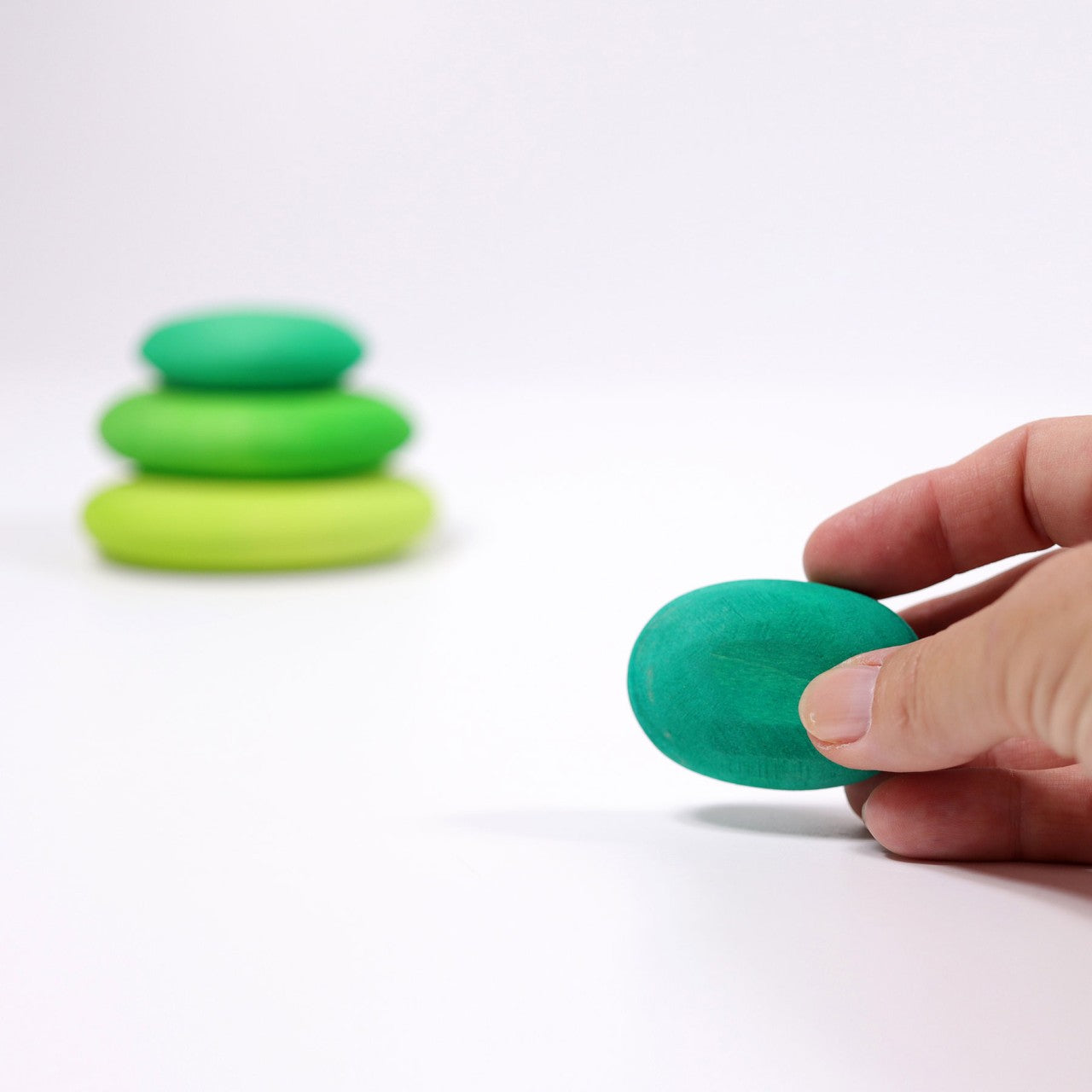 Diese Handschmeichler sind ein kniffliges Balance Spiel beim Stapeln und Bauen. Oder sie bereichern kleine Welten: die Steine können in einem Fluss liegen (Seidentuch), eine Höhle bestücken in einem Wald oder bilden ein steiniges Gelände.