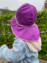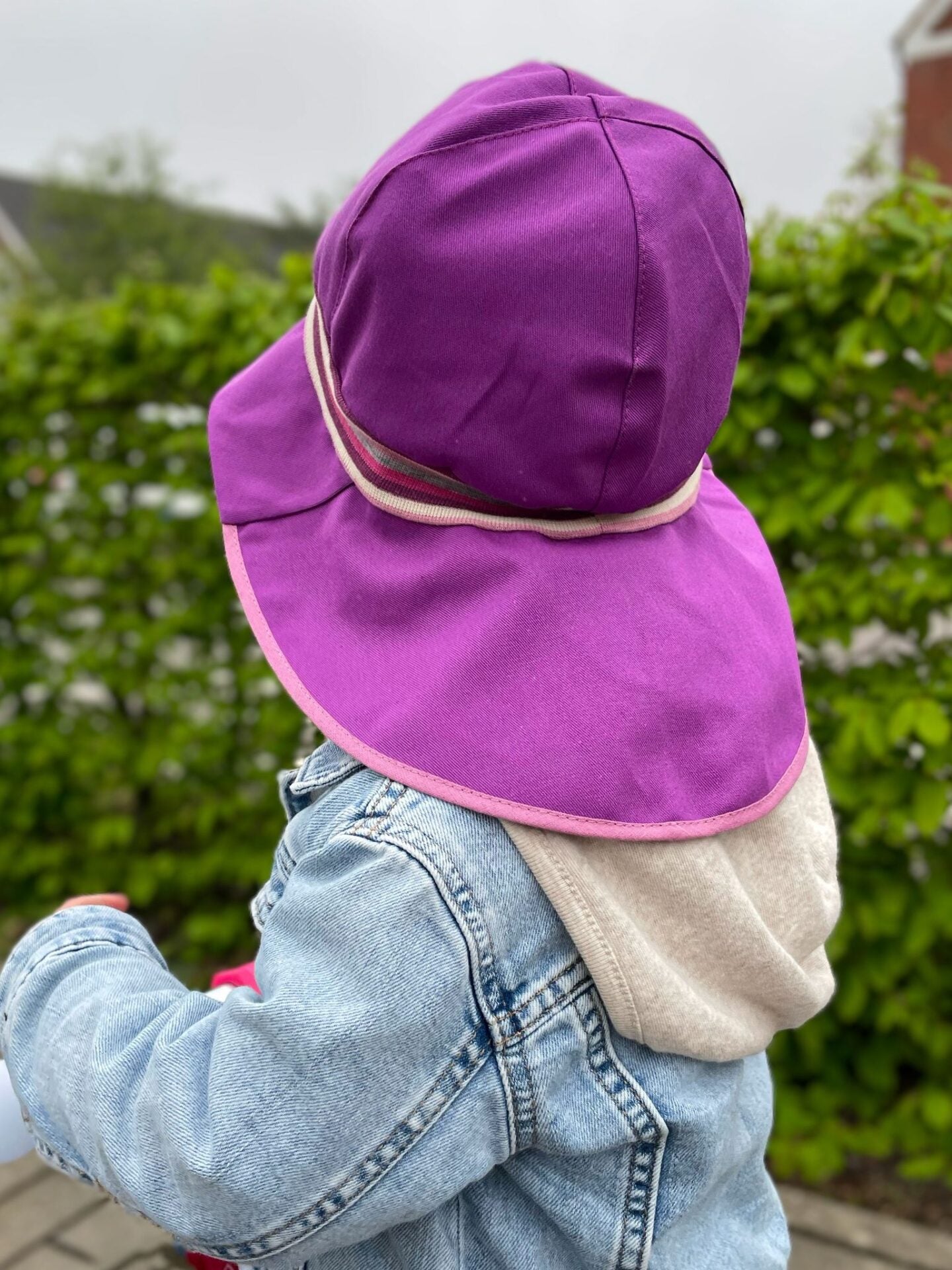 Die schöne und leichte Sommermütze ist mit einer umlaufenden Krempe, einem langen Nackenschutz und LSF 80 ausgestattet. Die Bindebänder geben den nötigen Halt und verhindern das "Wegfliegen", wenn es mal etwas stürmischer zugeht. Der elastische Bund aus weichem Jerseystrick schmiegt sich nicht nur sanft und bequem an den Kopf, sondern sieht mit seinem Streifenmuster auch richtig hübsch aus.
