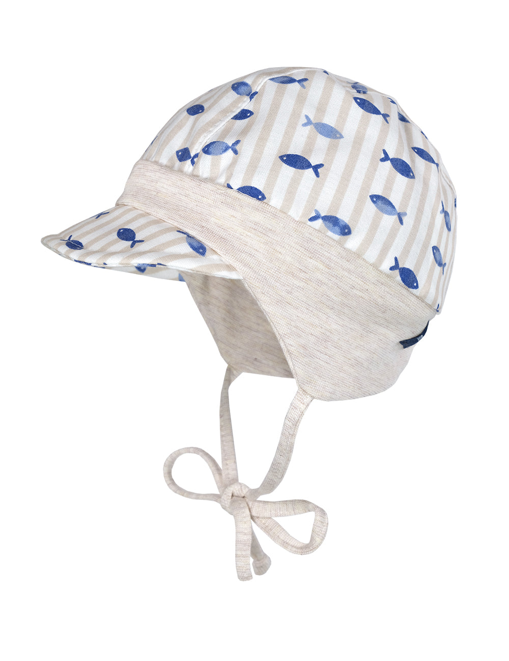 Die supersüße und leichte Sommermütze ist für die Babys super angenehm zu tragen. Nackenschutz, Bindbänder und Sonnenschild mit niedlichen Fischchen. Stoff in leichter Jeansoptik
