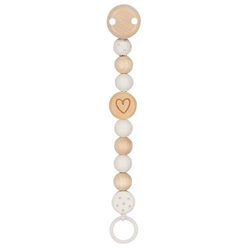 Schnullerkette von goki - hochwertig, sicher, und kindgerecht. Dieses Produkt der goki-baby-Serie enthält hochwertige Silikonperlen, sie verleihen dem Spielzeug einen zusätzlichen haptischen Reiz für die Entwicklung der Sinne. Und die Holzteile werden durch liebevolle Gravuren verziert.