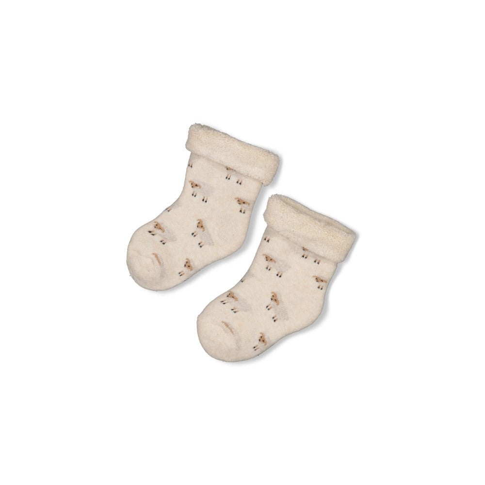 Innen sind die Söckchen Frottee-kuschelig und außen sind kleine Schäfchen eingestrickt. Herrlich bequeme Passform für die kleinen Füßchen.