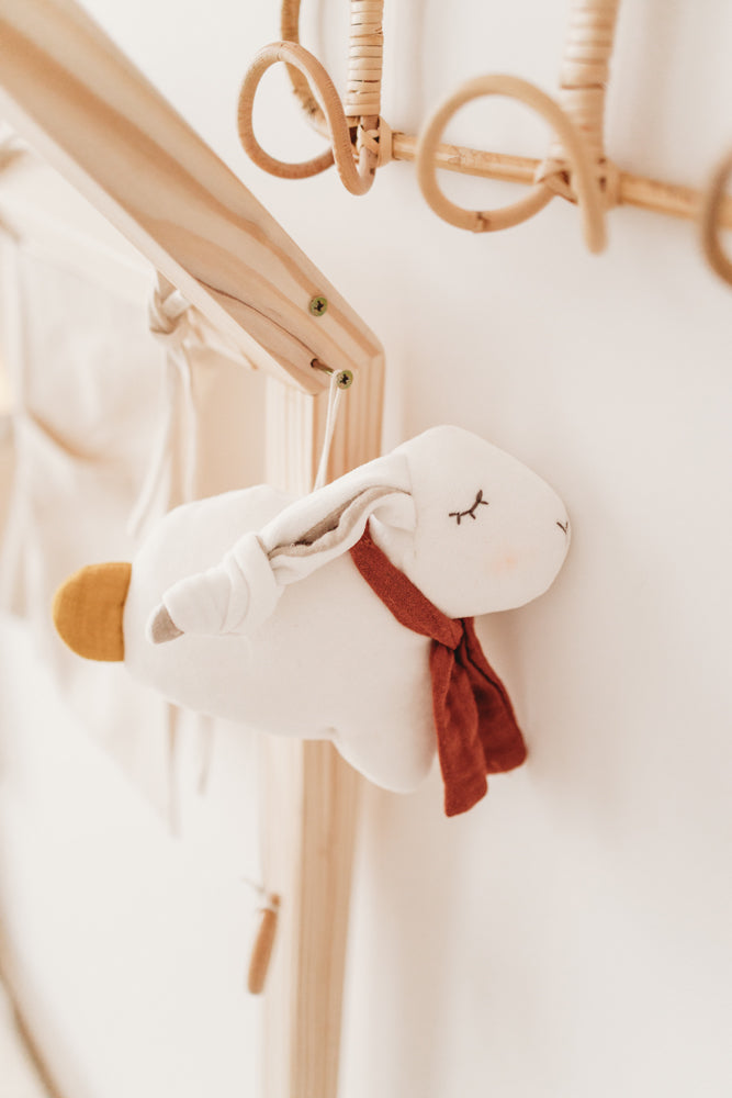 Die kleine Hasen-Spieluhr lässt Kinderherzen höherschlagen und wiegt dein Baby mit zauberhaften Klängen sanft in den Schlaf. Der kuschelige Hase aus Bio-Baumwolle ist einfach zum Verlieben. Dank des Aufhängers lässt sich die Spieluhr ganz einfach überall befestigen. Die Spieluhr kann zum Waschen ganz einfach herausgenommen werden.