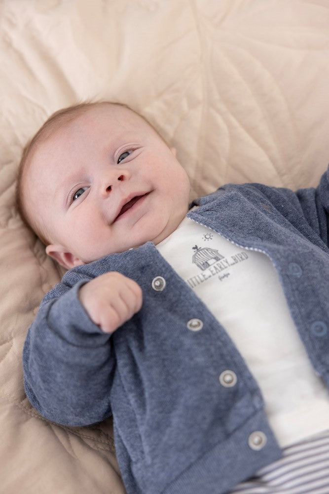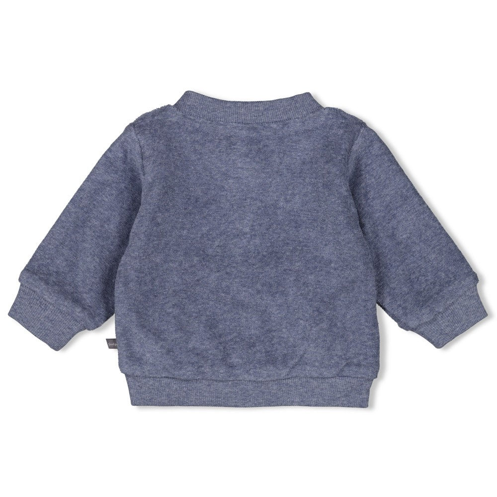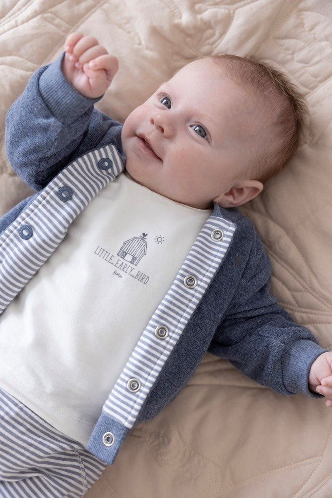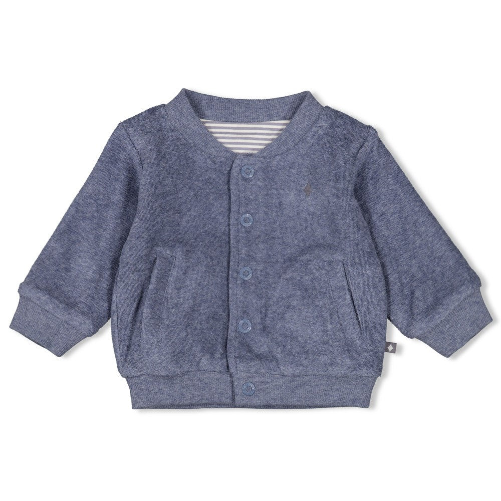 Diese schöne, etwas dickere Jacke ist einfach lässig und perfekt für etwas kühlere Tage. Die Jacke ist mit Bio-Baumwolle gefertigt. Zwei Looks in einem: eine Seite hat das knuffige, kuschelige Frottee und die andere ist in geringeltem Jerseystoff. Wenn die Ärmel umgekrempelt werden, blitzt die andere Seite hervor.